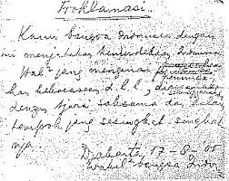 Kami bangsa Indonesia dengan ini menjatakan kemerdekaan Indonesia.